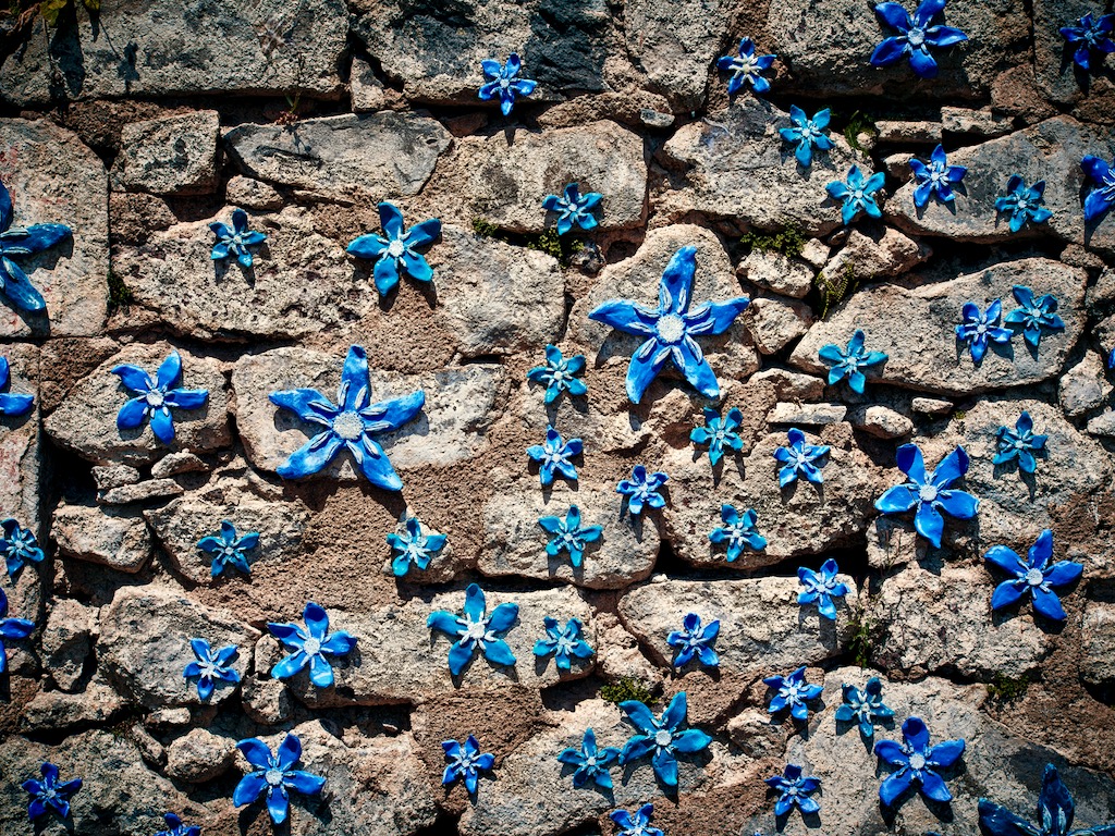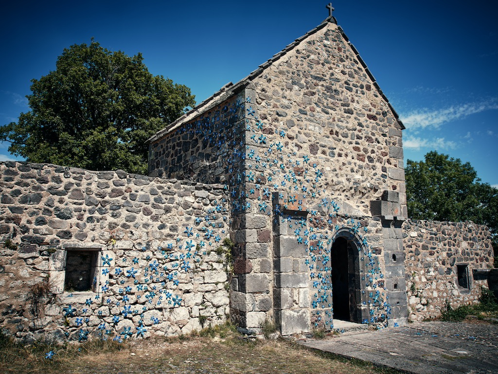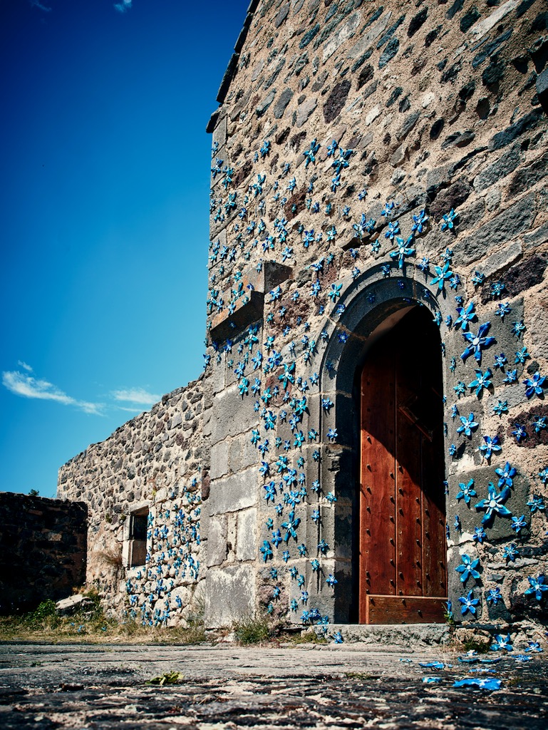 L’installation « Fleurs de lave » prend place sur la façade de la chapelle du Pic Saint-Pierre, au cœur des volcans d’Auvergne. Inspirée par la force tellurique de ce paysage, elle représente des fleurs emblématiques de la région façonnées à la main en plâtre et céramique. On peut citer par exemple la pensée des montagnes, la gentiane, l’épilobe ou encore la soldanelle, espèces qui prospèrent sur les sols volcaniques riches en basalte et en pouzzolane.