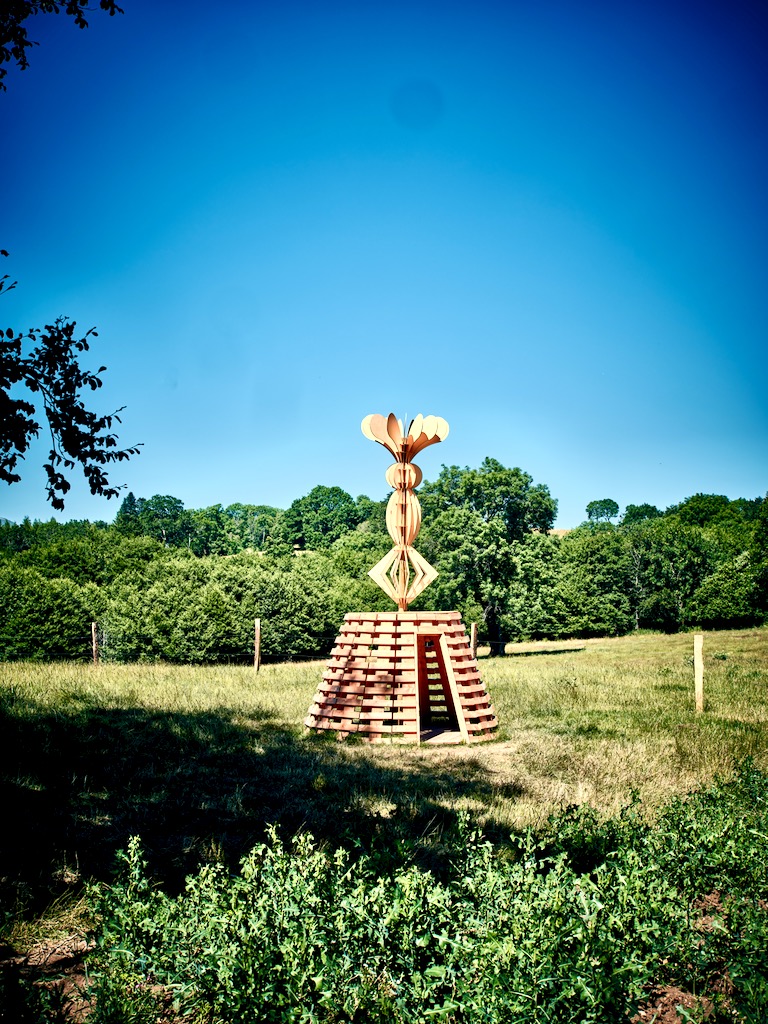 Face aux crises climatiques, nous devons apprécier et préserver notre planète. Le Japon, terre plus jeune que le Sancy, est marqué par des croyances animistes influençant son rapport à la nature. Inspiré par ces idées, l’artiste a conçu ce pavillon, à la fois maison de thé et observatoire. Ses formes évoquent la naissance de la terre, les sources nourricières, les collines sculptées par le temps et l’éclosion d’une nouvelle vie née du chaos.