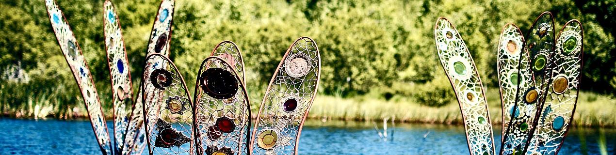 Les ailes, sur une structure de métal, sont ornées avec soin de pierres volcaniques et de disques de verre récupéré coloré. Grâce à un crochet réalisé avec des fils naturels, elles créent une esthétique qui évoque l’effet délicat de dentelle des vraies ailes des libellules. Chaque détail est conçu pour capturer la lumière et créer des reflets dansants sur l’eau, formant un arc-en-ciel scintillant.